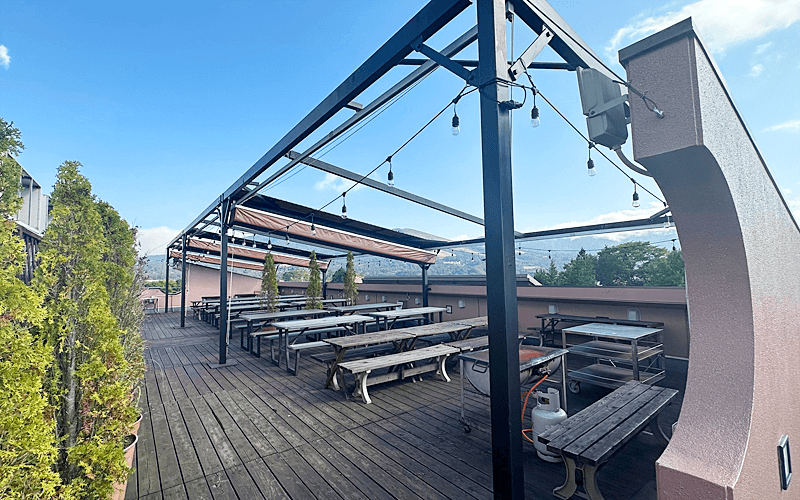 富士山と山中湖を望む屋上バーベキュー。全天候型の開放感あふれる空間で、気軽に特別なひとときが過ごせます。